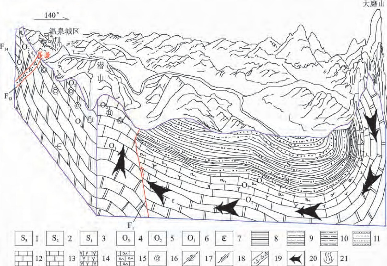 咸寧地質(zhì)構(gòu)造位置處于揚(yáng)子準(zhǔn)地臺(tái)梁子湖坳陷與咸寧臺(tái)褶束的交接部位,從屬于大幕山復(fù)式背斜北翼的次級(jí)構(gòu)造—高橋向斜、孫鑒鋪倒轉(zhuǎn)背斜、賈家山倒轉(zhuǎn)向斜的西延部分,由一系列的緊密褶皺組成區(qū)內(nèi)的基本構(gòu)造骨架。新華夏晚期構(gòu)造體系在潛山一帶表現(xiàn)強(qiáng)烈,其中大義山式斷裂有明顯的反映。這些不同的構(gòu)造體系互相干擾、復(fù)合,不僅控制了區(qū)內(nèi)的巖性組合、地貌、巖溶發(fā)育,而且也嚴(yán)格控制了地下水的分布及其補(bǔ)給、運(yùn)移和排泄。潛山背斜是地?zé)崽?/a>的主要構(gòu)造骨架,其特點(diǎn)是呈梳狀,且向南東倒轉(zhuǎn),區(qū)內(nèi)溫泉斷裂規(guī)模最大,且是經(jīng)過(guò)多次構(gòu)造變動(dòng)的復(fù)合性斷裂,先期為縱張斷裂且以垂直運(yùn)動(dòng)為主,后期表現(xiàn)為逆向復(fù)合,并受逆時(shí)針的應(yīng)力作用而顯壓扭性特征,是深切割斷裂,也是控制區(qū)內(nèi)地?zé)崃黧w分布的主要斷裂。