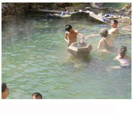云南巴臘掌溫泉風景在諸泉中,最有特點和傳奇色彩的要數“仙人澡塘”。在一塊高出河面約25米的巖石上,共有3潭泉水:大的面積約為4平方米, 小的面積分別為0.4和0.5平方米,相隔僅20厘米,卻一冷一熱, 熱的溫度高達95攝氏度,冷的只有20攝氏度。